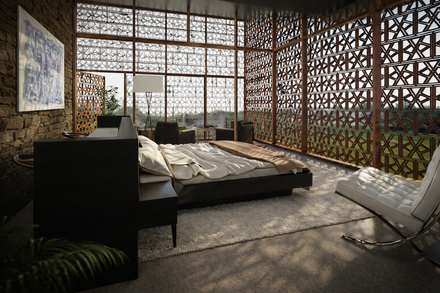 The architectural language is grounded in proportion, depth, and layered surfaces. Upper levels are wrapped in perforated wood screens that filter sunlight and produce shifting patterns of shadow throughout the day. Deep overhangs and recessed glazing temper heat and glare, reinforcing environmental performance through passive strategies.